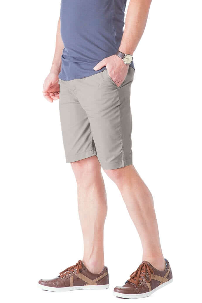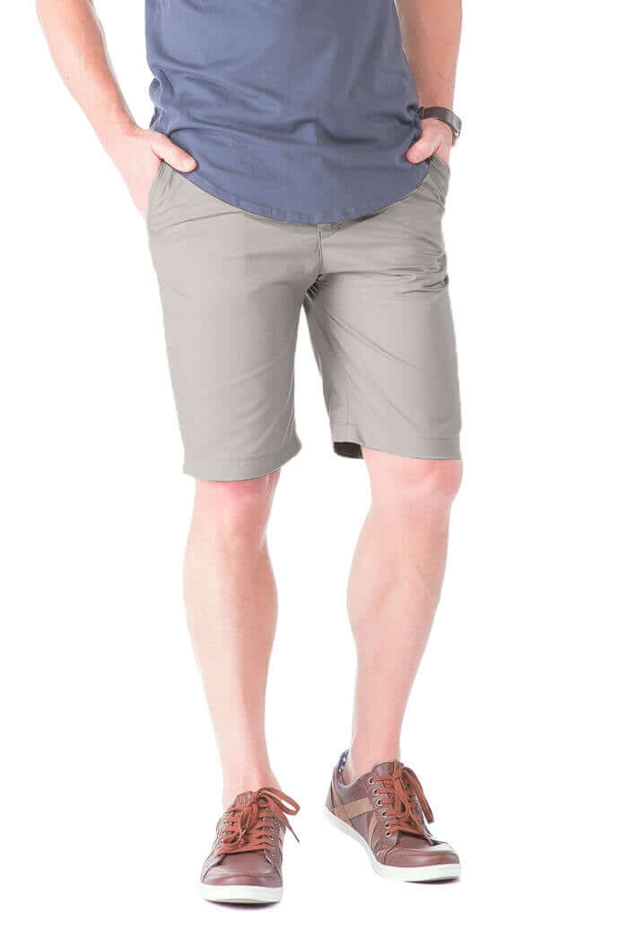 Our updated and refined chinos shorts are comfortable, soft, and guaranteed to fit! These muted gray chinos are versatile and will pair well with various colors. 98% Cotton, 2% Elastane 8.5 oz Twill