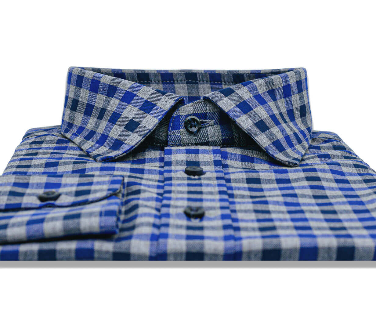 Our highest thread counts with a superior hand feel! Navy, blue, and gray overlap to create a check pattern in this comfy shirt. 100% Cotton Twill 140's 2-Ply, Light Weight