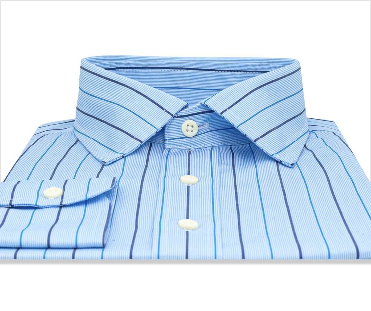 Capture the calm of the open waters in this blue multi-stripe shirt. 100% Cotton Broadcloth 120's 2-Ply, Medium Weight