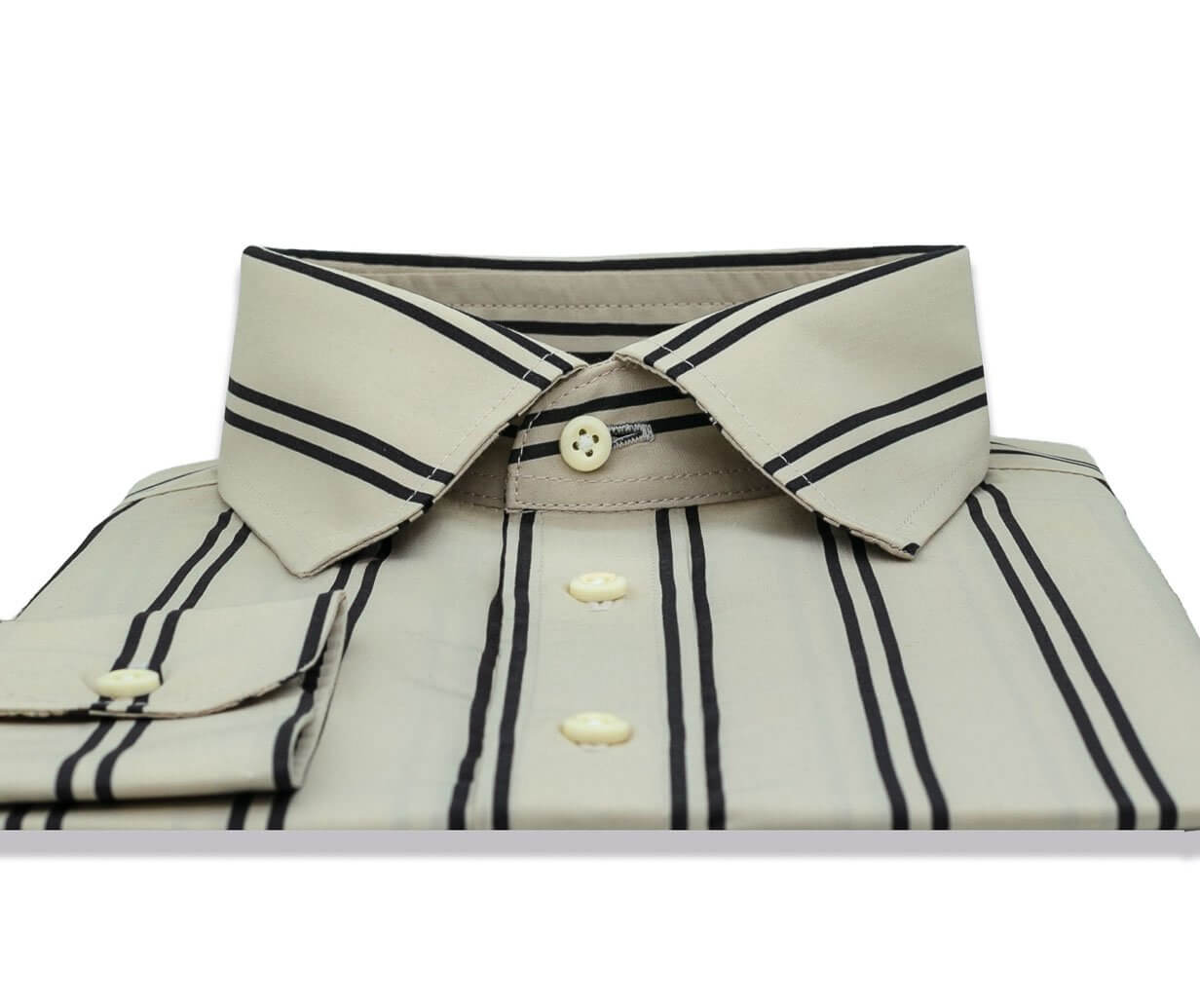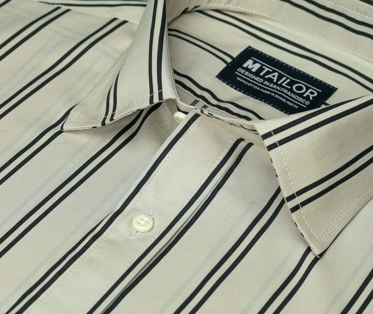 Bold black stripes on warm tan make this shirt a standout piece with confident, earthy style. 100% Cotton Broadcloth 120's 2-Ply, Light Weight
